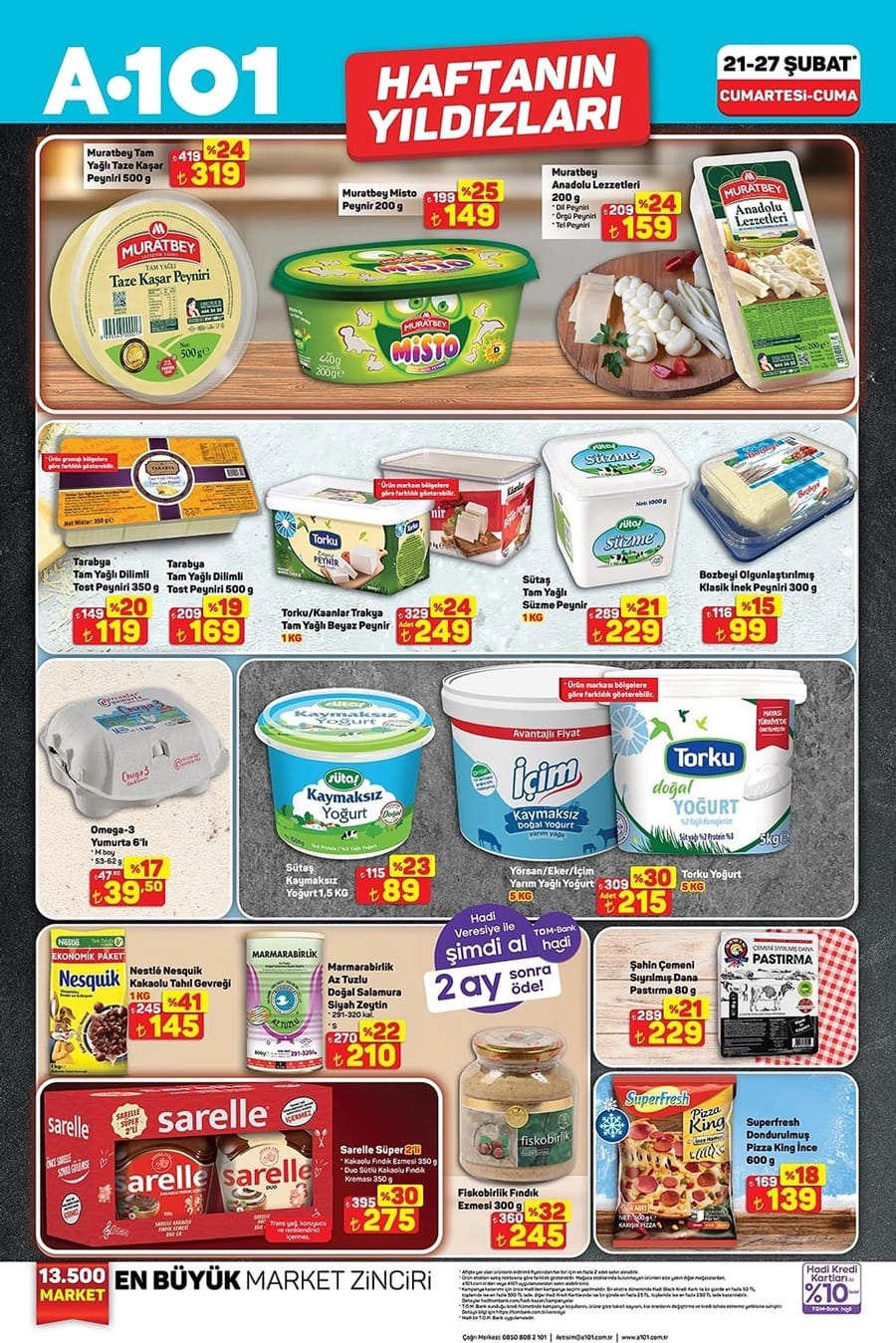 A101, 21-27 Şubat 2026 tarihleri arasında geçerli olacak yeni “Haftanın Yıldızları” kataloğunu yayımladı. 10 kg deterjandan 5 kg yoğurda, Ramazan sahur sofralarının vazgeçilmezi peynir çeşitlerinden dev pizza fırsatlarına kadar yüzlerce ürün raflardaki yerini aldı. İşte cebinizi ferahlatacak o listenin tamamı…